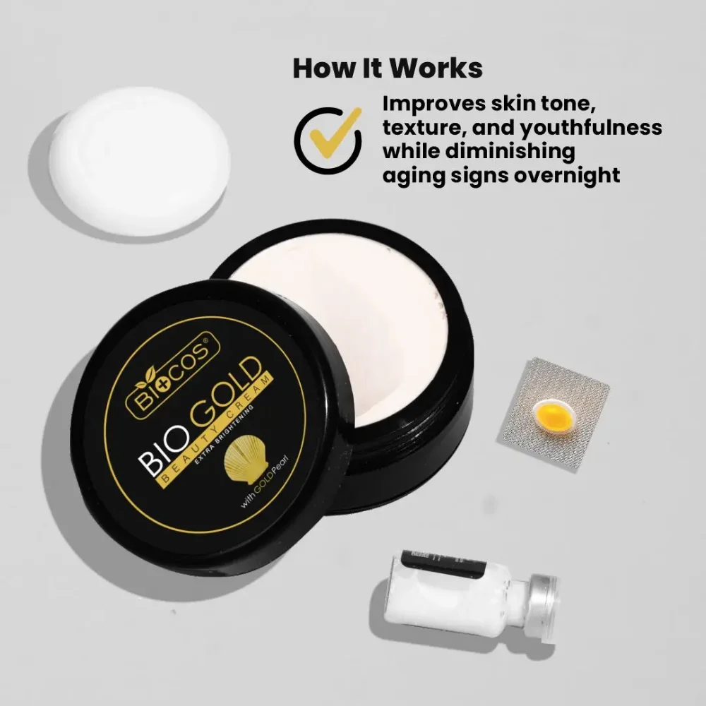 Bio Gold Beauty Cream 4in1 is an advanced skincare formula designed to provide complete care by brightening, hydrating, and reducing signs of aging. Enriched with Alpha Arbutin, Gold Dust, and Kojic Acid, this cream works effectively to lighten dark spots, even out skin tone, and enhance overall radiance. The presence of gold particles revitalizes dull skin, giving it a youthful glow, while Kojic Acid targets pigmentation for a visibly clearer complexion. Bio Gold Beauty Cream 4in1 also improves skin elasticity, helping to reduce fine lines and wrinkles for a smoother, firmer texture. Its deep hydrating properties ensure long-lasting moisture, keeping your skin soft, plump, and nourished throughout the day. Suitable for all skin types, this cream absorbs quickly without leaving a greasy feel. With regular use, it restores skin balance, prevents early aging, and promotes a healthy, luminous glow. Make Bio Gold Beauty Cream 4in1 a part of your daily skincare routine for younger-looking, brighter, and rejuvenated skin.