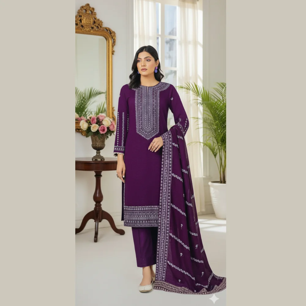 The DARAKSHAN Dhanak Doria 3 PCs Suit is a luxurious winter ensemble designed for women who appreciate elegance and warmth. Crafted with premium-quality Dhanak Doria fabric, this suit reflects rich craftsmanship and timeless appeal. Perfect for winter gatherings and festive occasions, it offers comfort with a graceful silhouette. Shirt (Kameez): The heavy embroidered Dhanak Doria shirt features detailed embroidery work that enhances its regal look while maintaining softness and warmth. Shawl (Dupatta): The 4-patti embroidered shawl adds a statement touch, offering both insulation and artistic beauty with intricate embroidery. Trouser (Shalwar): The plain Dhanak trouser balances the outfit perfectly, ensuring ease of movement and all-day comfort.