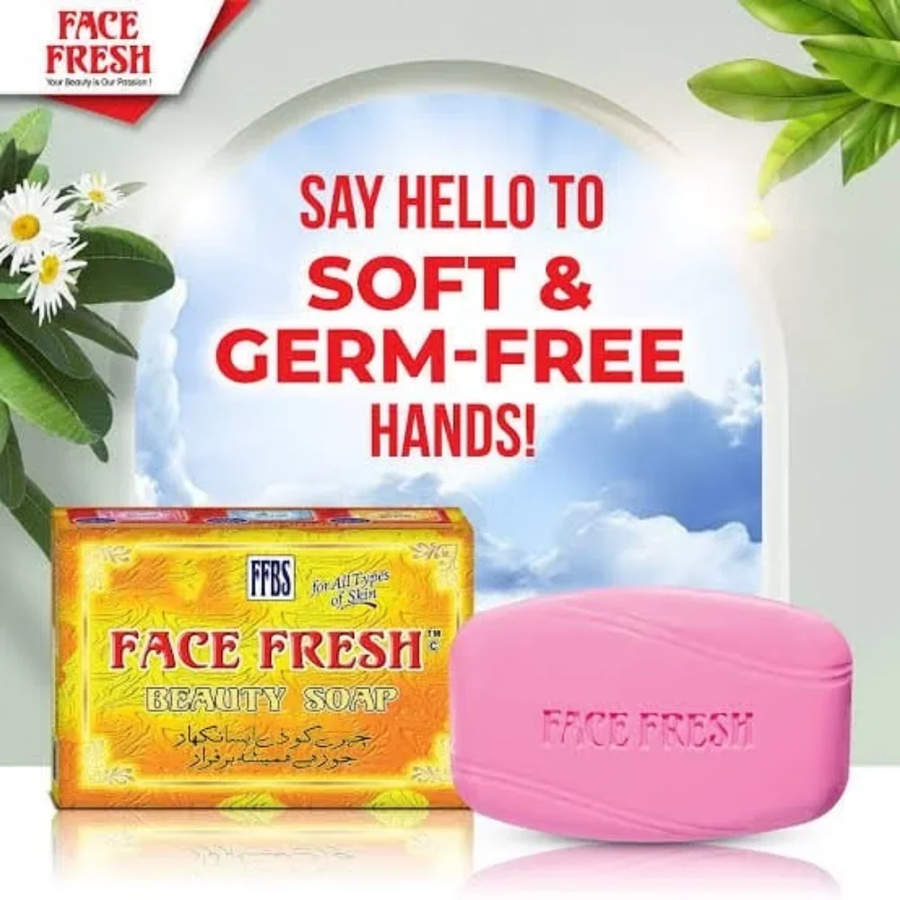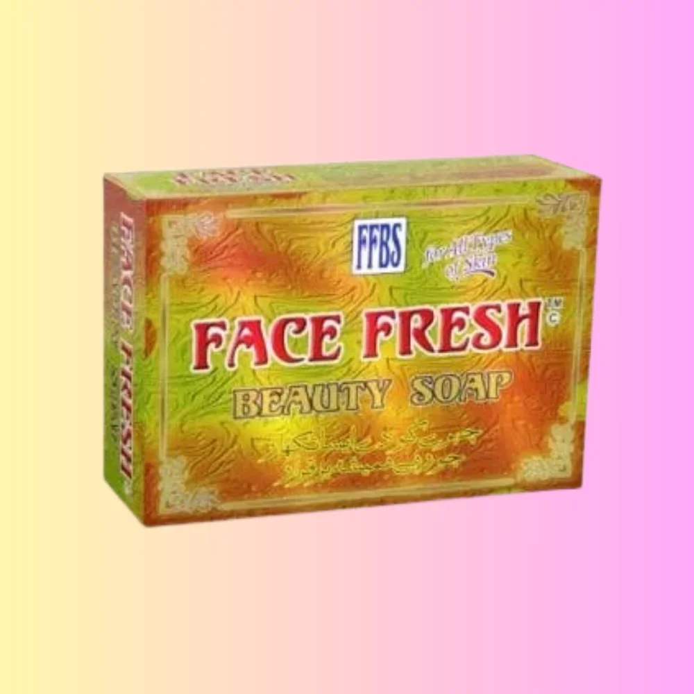 FaceFresh Glow Beauty Soap 100g is a gentle beauty soap for glowing skin that helps you achieve a clean, soft, and radiant look. Enriched with natural ingredients like rose extract, vitamin E, and glycerin, it hydrates and nourishes your skin from within. The rich lather removes dirt, oil, and makeup residue without making your skin dry. This soap helps brighten your complexion and leaves your face visibly fresh and smooth. Its mild formula suits all skin types and is safe for daily use. It also helps to reduce dullness and enhances your skin’s natural glow. With regular use, it keeps your face soft, clear, and evenly toned. The refreshing floral fragrance uplifts your mood and keeps your skin smelling great all day. It supports skin softness and elasticity while preventing rough patches. FaceFresh Glow Beauty Soap also helps reduce the appearance of minor blemishes over time. It protects your skin from pollution and dryness caused by weather changes. Perfect for both men and women who want naturally glowing skin. Use twice daily for best results. Make this beauty soap your daily skincare essential. Let your skin shine with softness, freshness, and confidence.