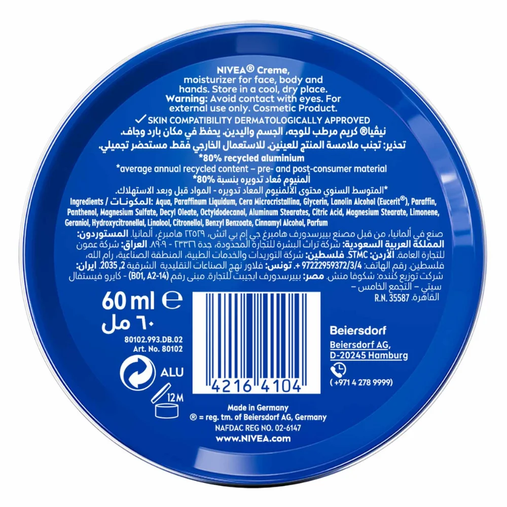 NIVEA Creme is the classic, rich moisturizing cream trusted by millions for generations. Known for its iconic blue tin and signature mild fragrance, this cream provides intensive hydration and long-lasting moisture for even the driest skin. Enriched with Eucerit, a unique moisturizing ingredient, it helps lock in moisture and protect the skin’s natural barrier. Its thick, creamy texture is perfect for use on the face, hands, body, and even rough areas like elbows and knees. Ideal for all skin types, including sensitive skin, NIVEA Creme works year-round to keep your skin feeling soft, smooth, and deeply nourished. The gentle, dermatologically tested formula makes it suitable for the whole family, from kids to adults. Whether used as a daily moisturizer, night cream, or winter skin protector, this multi-purpose cream delivers reliable care you can count on. With NIVEA Creme, your skin stays healthy, hydrated, and beautifully cared for in every season.