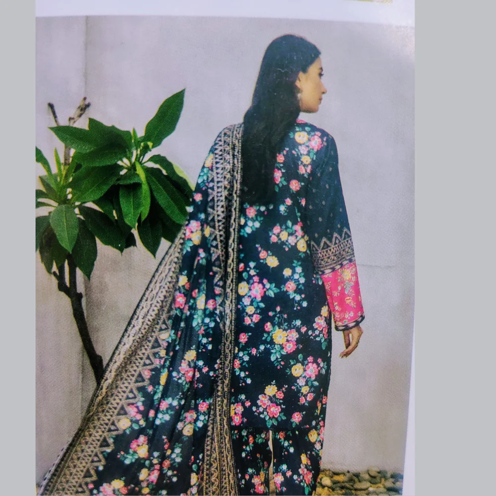 SOKAMAL 3 PC Digital Printed Lawn Suit is a beautifully crafted summer outfit designed for women who love vibrant prints and breathable fabrics. Made from premium quality lawn, this suit ensures maximum comfort during hot weather. The digital printed lawn shirt features modern patterns that give a fresh and elegant look. Its lightweight texture allows easy movement and all-day wear without discomfort. The matching digital printed lawn dupatta enhances the overall appeal with coordinated colors and stylish detailing. The soft lawn fabric keeps you cool and relaxed throughout the day. The plain lawn trouser adds balance to the printed shirt and dupatta for a neat and graceful finish. This combination makes it suitable for daily wear as well as casual gatherings. The stitching-friendly fabric allows you to customize the fit according to your style. The high-quality digital printing ensures long-lasting color and sharp design clarity. This outfit blends fashion with practicality for effortless summer styling. SOKAMAL 3 PC Digital Printed Lawn Suit is a must-have addition to your seasonal wardrobe.